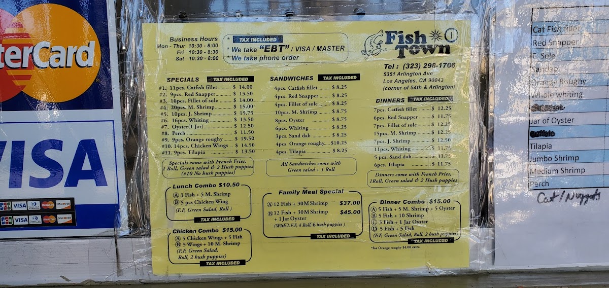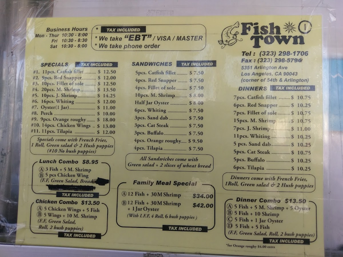 Welcome to Fish Town, located in the heart of Los Angeles. This seafood haven specializes in a delightful array of fish dishes that reflect both quality and flavor. Their menu boasts mouthwatering all-day specials, including the savory 11 Pieces Catfish Fillet and the succulent 9 Pieces Red Snapper, each served with golden fries, a roll, green salad, and hush puppies. For sandwich lovers, Fish Town offers irresistible options like the 4 Pieces Catfish Fillet sandwich, adorned with fresh condiments.